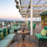 The atmosphere here is nothing short of spectacular. As you make your way to the rooftop, anticipation builds with each step. Upon arrival, you're greeted with stunning panoramic views of Beverly Hills and the sprawling Los Angeles skyline. The setting is perfect for a romantic dinner, a chic brunch, or an evening cocktail as the sun dips below the horizon. The ambiance is stylish and modern, inviting you into a chic lounge atmosphere that blends comfort with sophistication.